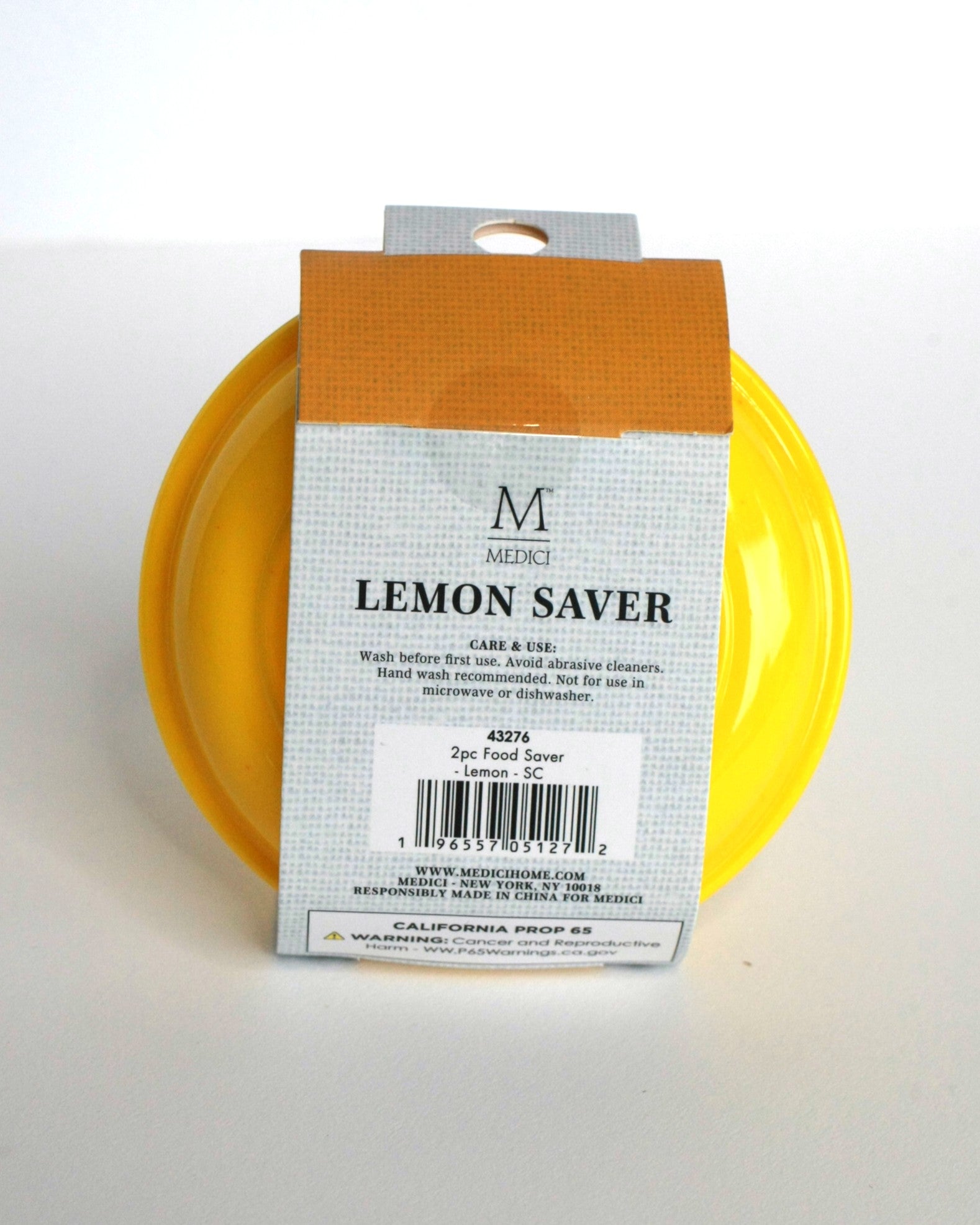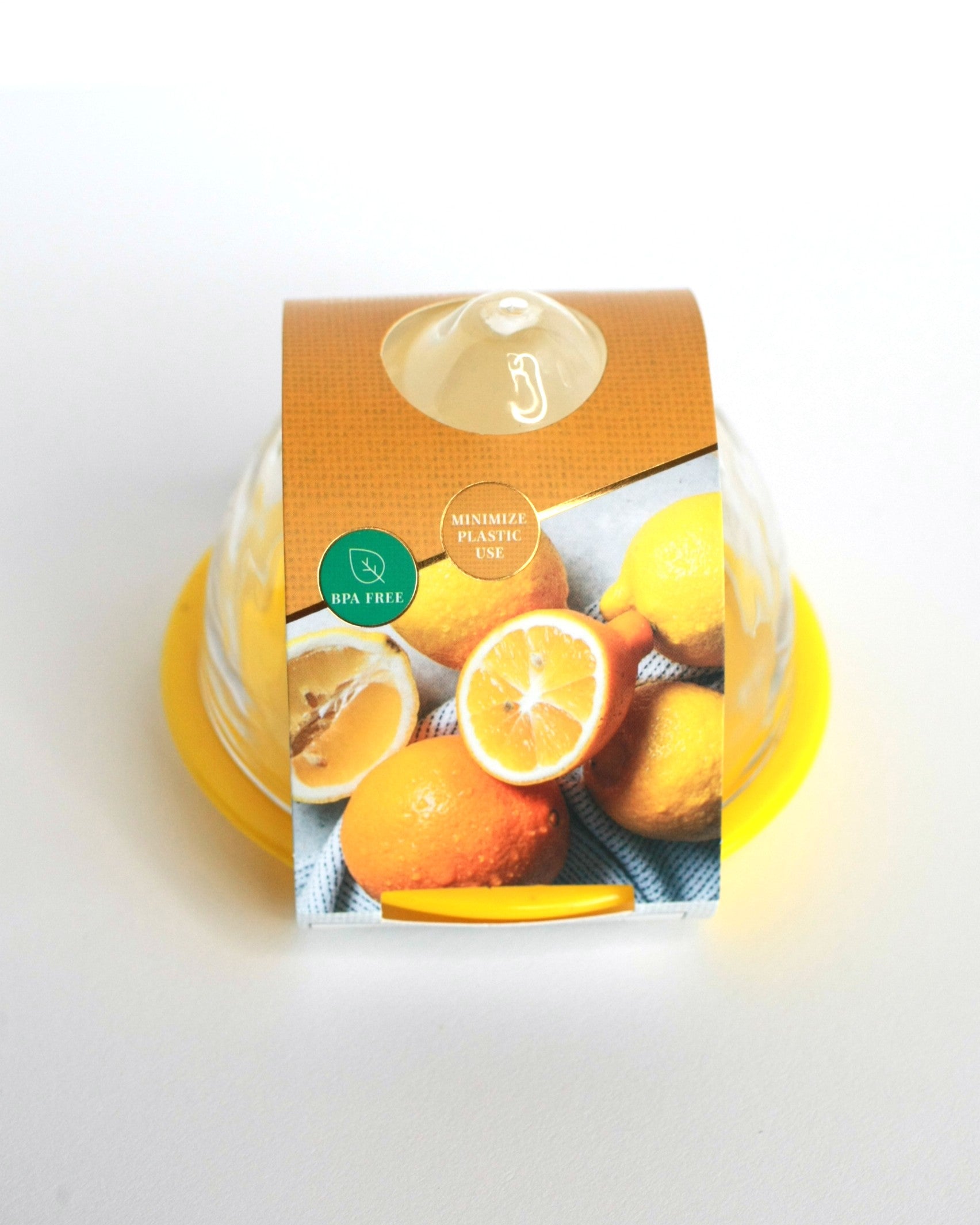 Bright yellow food saver features yellow base with a clear, domed citrus shaped lid. It's a wonderful and colorful kitchen solution for an opened lemon or other small sized food items.