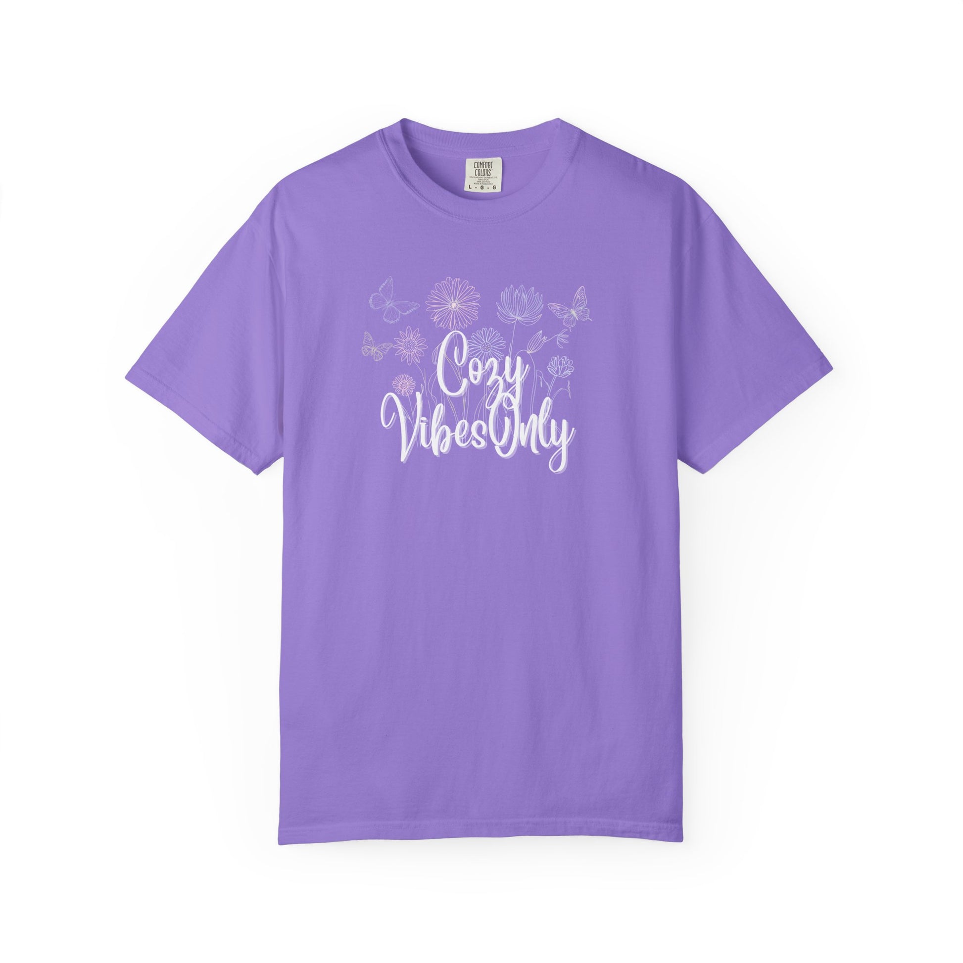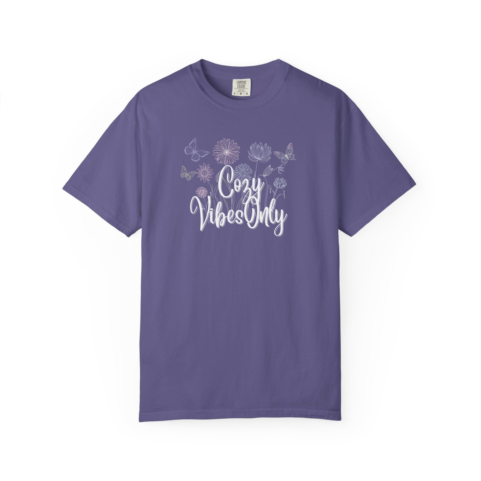 The tshirt design features "Cozy vibes only " message surrounded by delicate flowers and butterfies. Relaxed, easygoing style tee.
