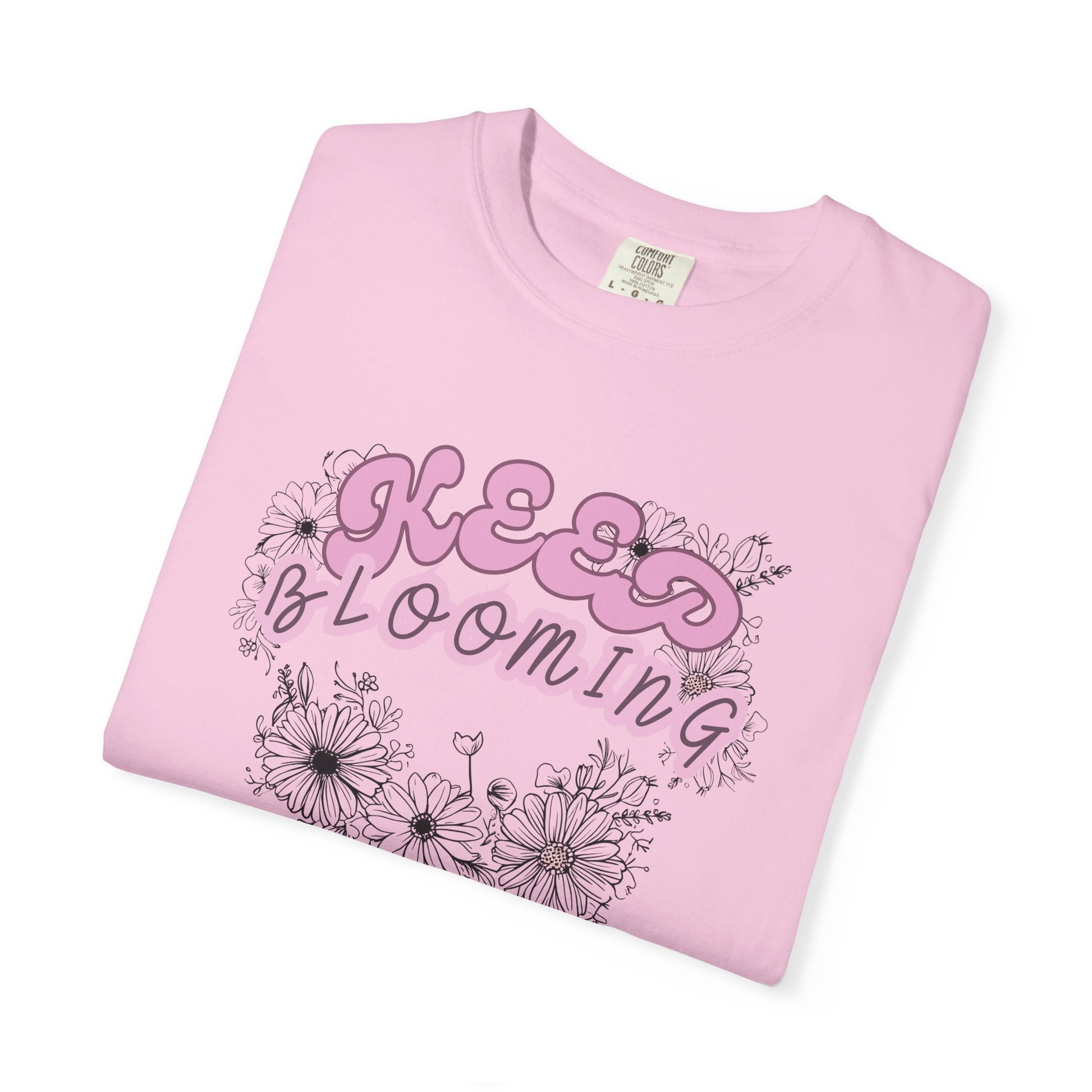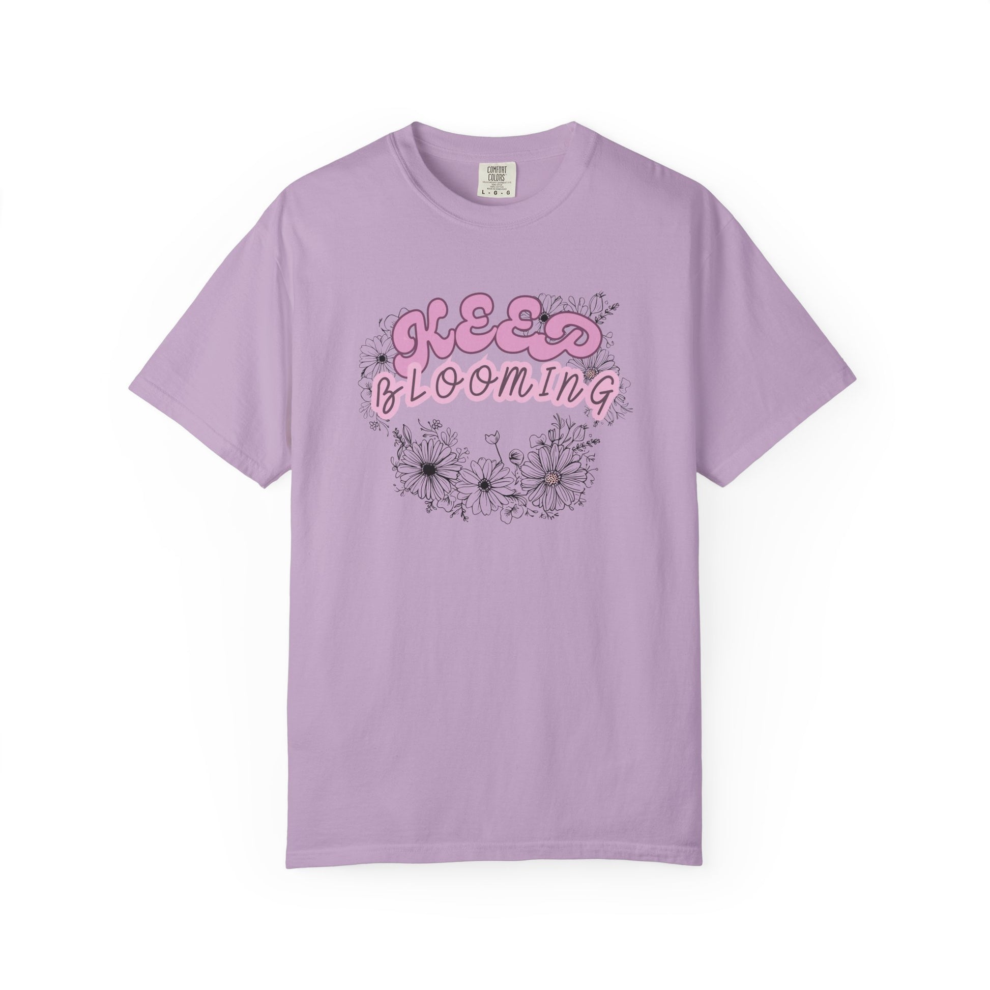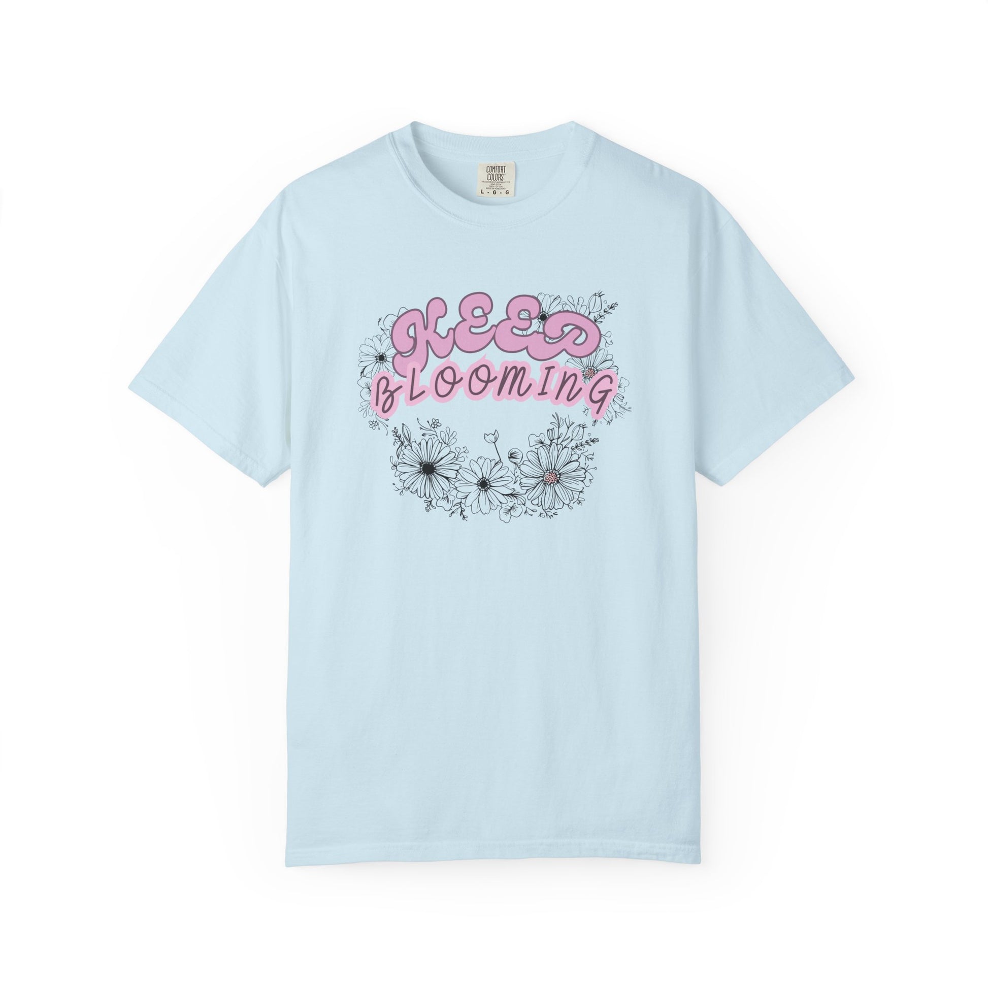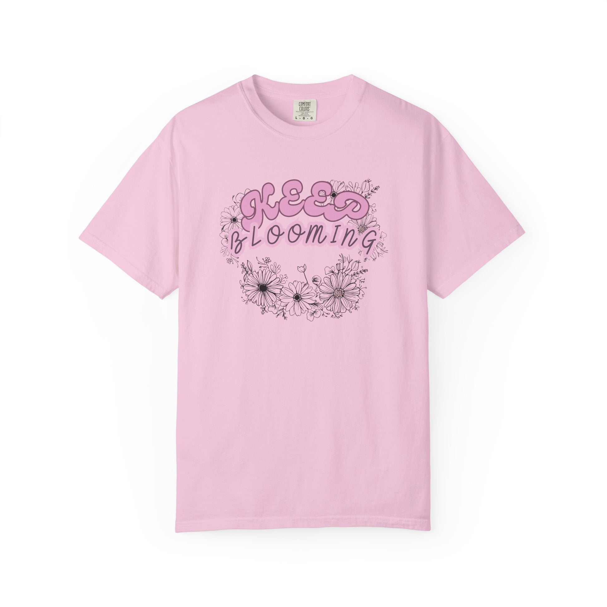 Floral design t-shirt with a uplifting "Keep Blooming" message. Fun and comfortable t-shirt from the Comfort colors t-shirt collection that is known for the relaxed fit, super comfortable and somewhat disstresed tee vibe.