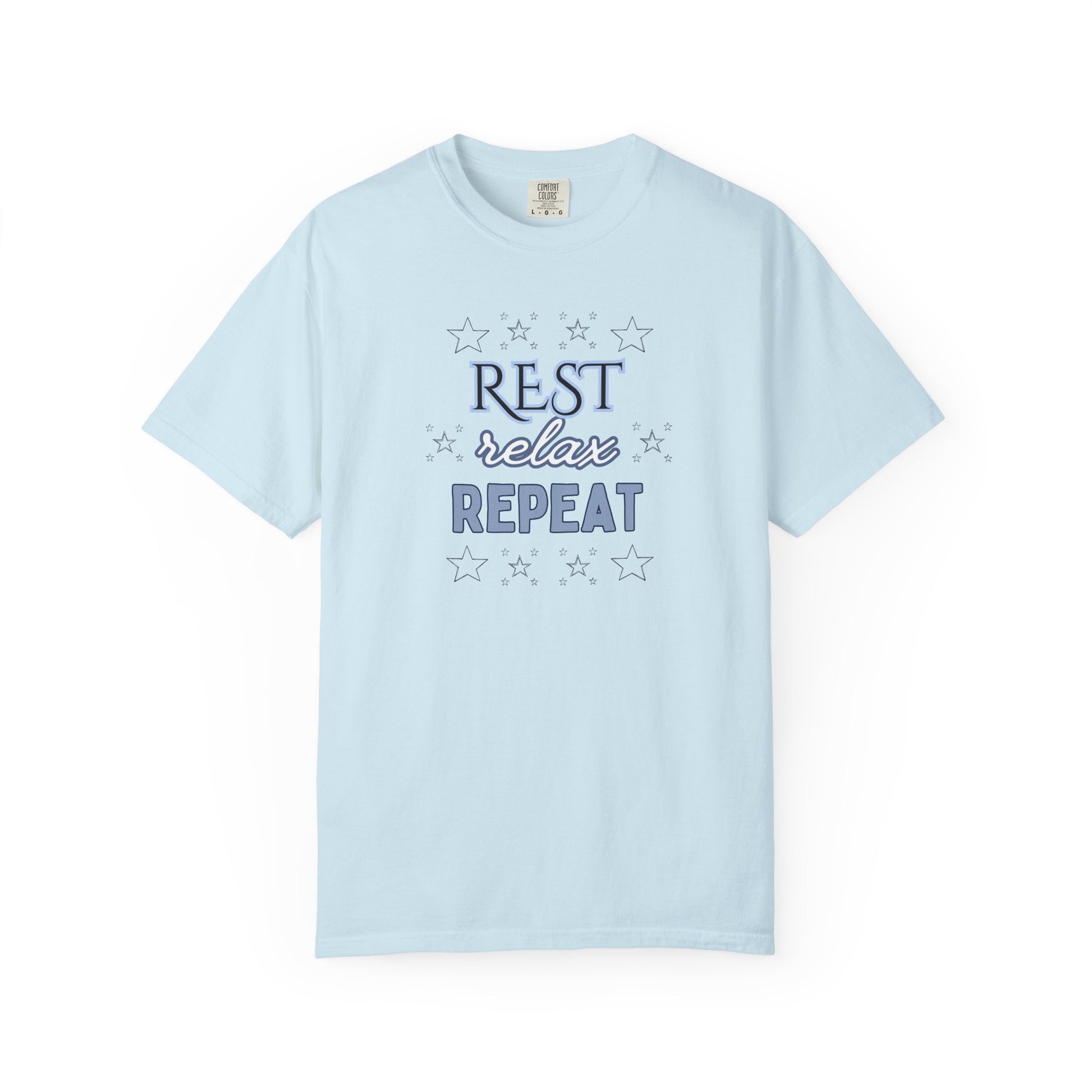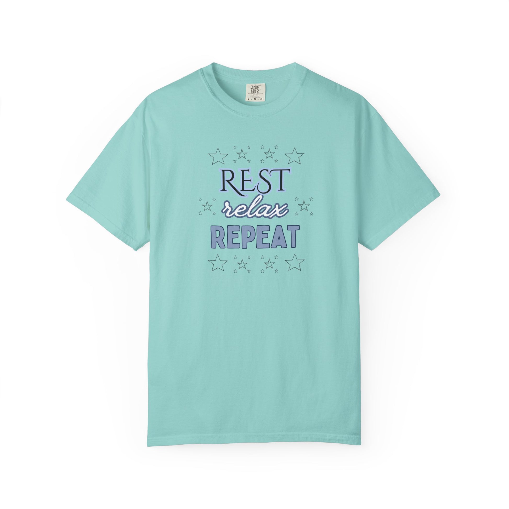 " Rest Relax Repeat" is Comfort Colors T-Shirt, a perfect blend of comfort and style. This relaxed-fit tee exudes a laid-back vibe, making it an ideal choice for lounging at home or a casual outing with friends. Its soft, garment-dyed fabric ensures a cozy feel against your skin, while the classic crew neckline offers versatility for accessorizing. Perfect for adults who value both comfort and fashion, this shirt is a great gift for occasions like birthdays, holidays, or just to brighten someone’s day.