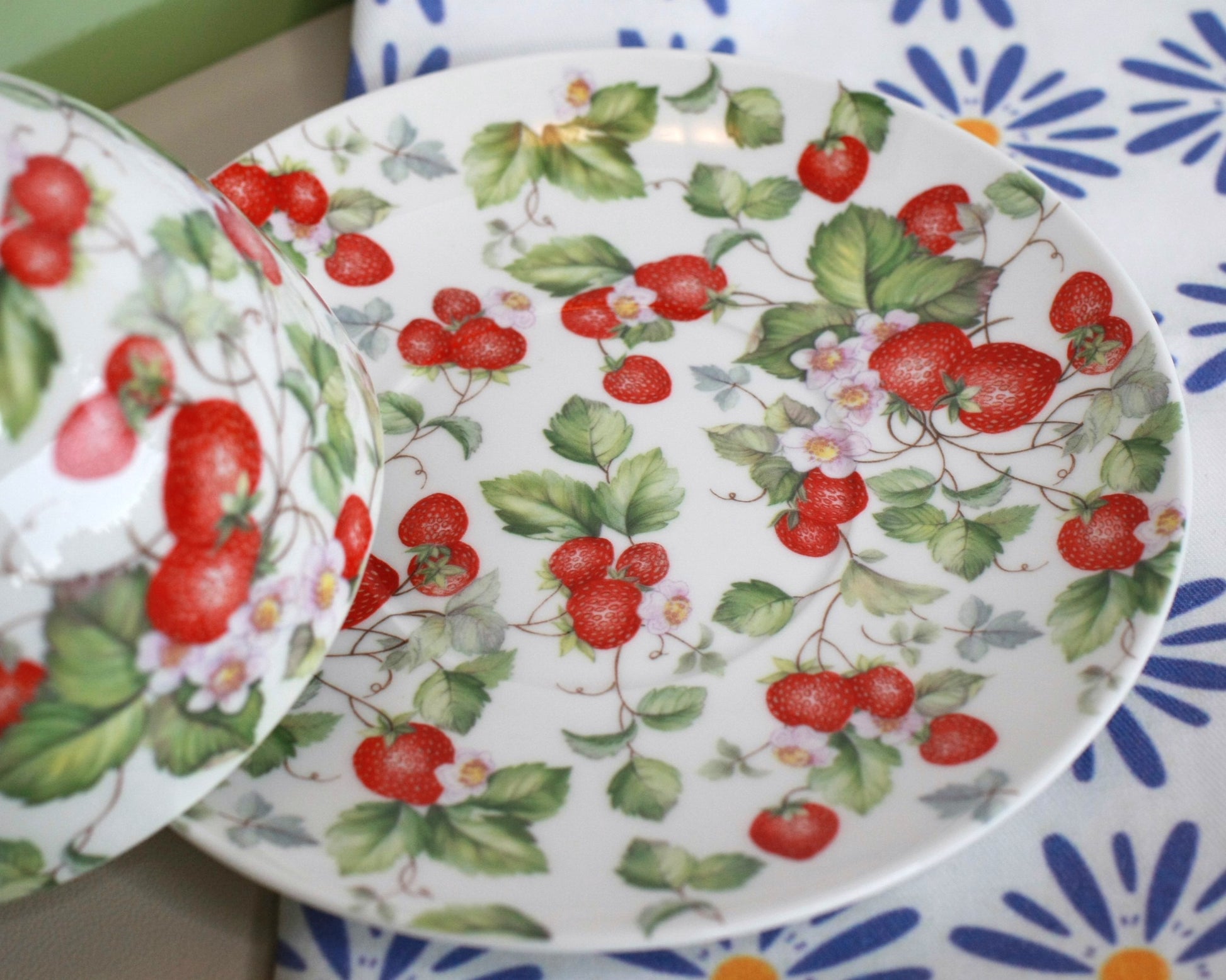 What so lovely about this porcelain strawberries cup and saucer it the abundance of fruit and strawberry flowers. This spring in a form of a cup is covered in vibrant colors of ripe strawberry fruit, delicate pink flowers and lush green leaves.